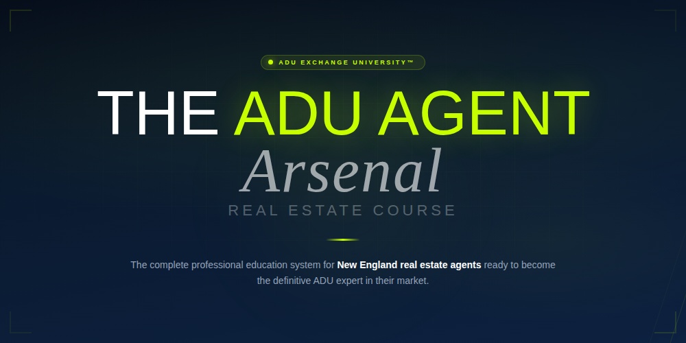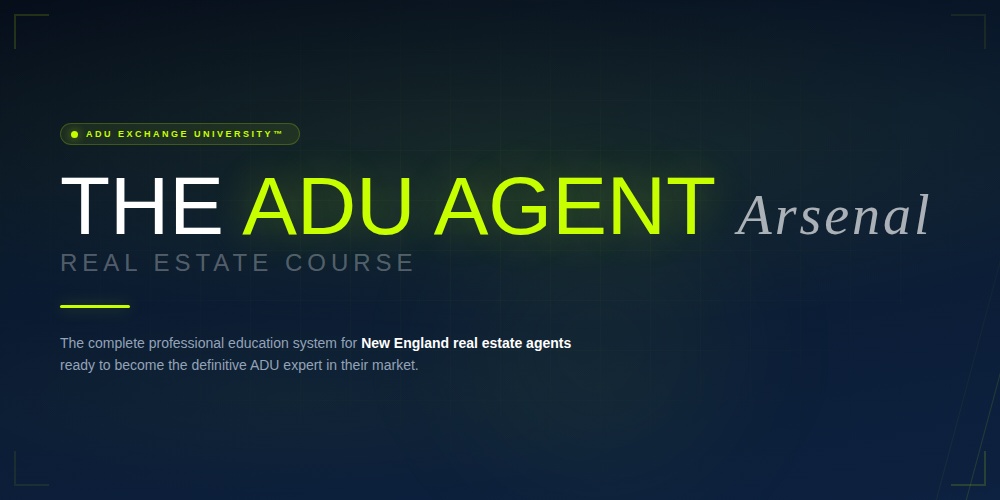 COURSE 01 "Understanding the ADU Opportunity" Comprehensive education on ADU markets, buyer segments, regulatory landscape, and professional positioning. Build foundational knowledge for ADU-focused practice.